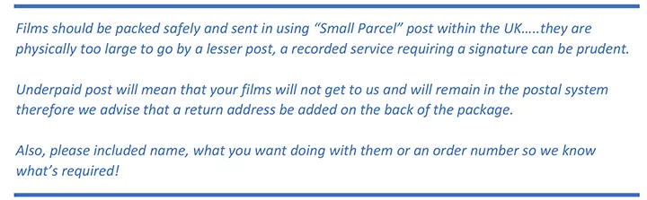 Please be aware that the postage charged at checkout is to cover the return post for your negatives…negatives are precious look after them!